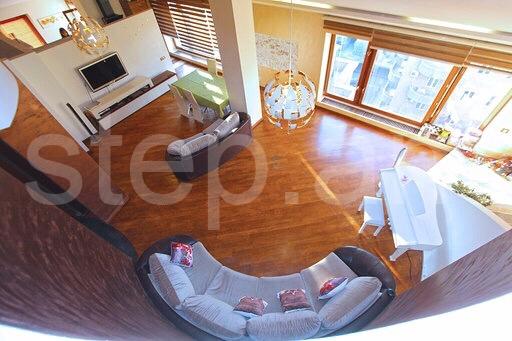 2-storey apartment occupies the 9th and 10th floors. The lower floor offers a living room, a kitchen, a bedroom, a rest zone and a balcony. Large and elegant stairs take to the upper floor. The latter features a bedrooms, a bathroom , and a terrace with a fireplace in it. It showcases  Yerevan center view and Mount Ararat.