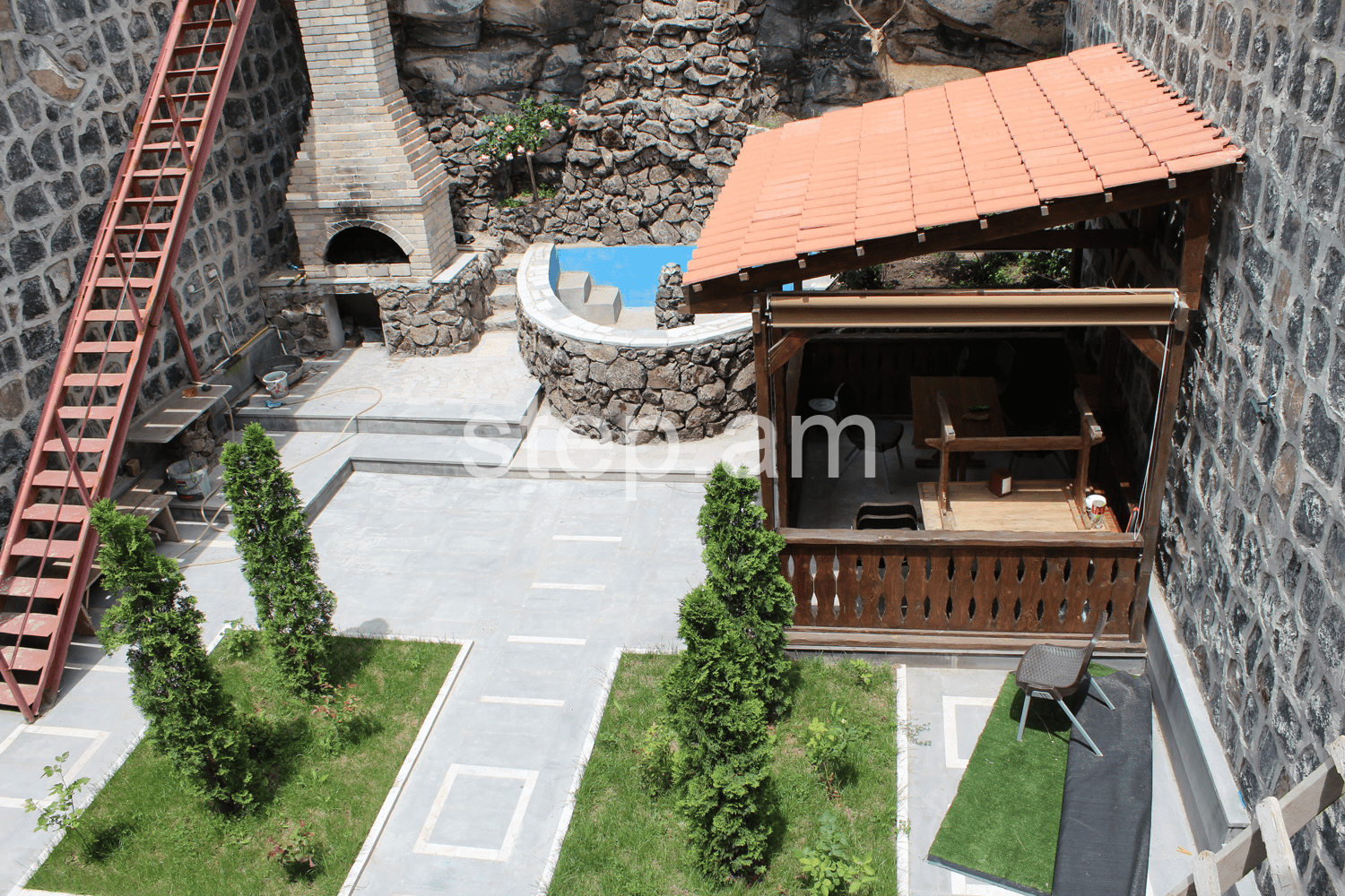 You can find a stylish wooden gazebo and fountain-waterfall in the garden.